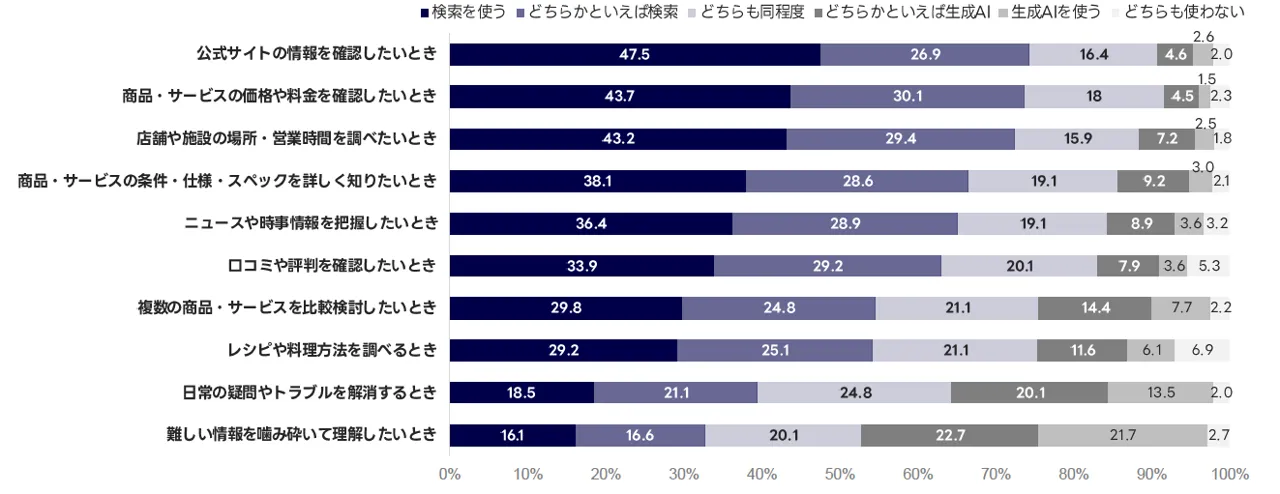 この結果から、より確かで正確な情報を確認する際には検索が、疑問の解消や難しい情報を理解したい場合には生成AIが使われるなど、目的に応じた役割分担が進んでいるといえそうです。