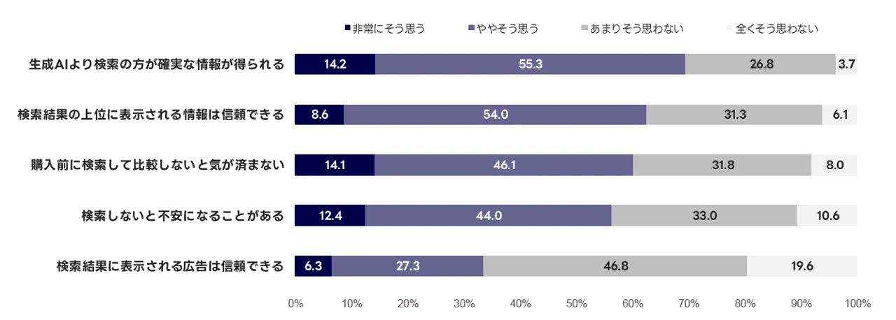 検索に対する意識を見ると、「生成AIより検索の方が確実な情報が得られる」「検索しないと不安になることがある」と感じているユーザーが多く見られます。また、「購入前に検索して比較しないと気が済まない」という回答も一定数存在しており、検索が単なる情報収集ではなく、判断や確認のための行動として使われていることがうかがえます。
