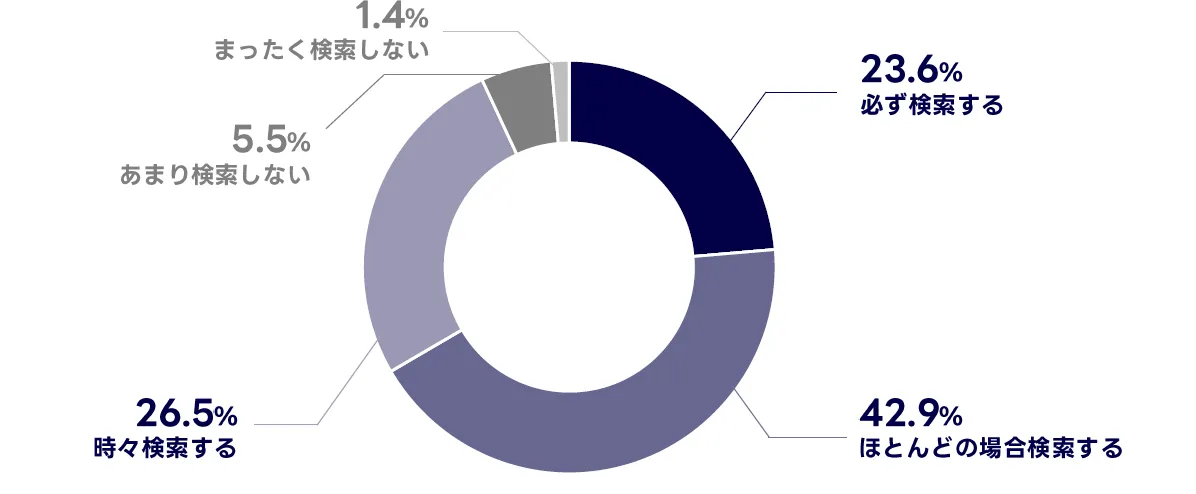 検索の重要性が特に表れているのが、購買や申し込みといった意思決定の直前です。本調査対象である日常的に検索を行うユーザーのうち、商品やサービスを購入・申し込みする前に「必ず」または「ほとんどの場合」検索を行うユーザーが多く見られました。