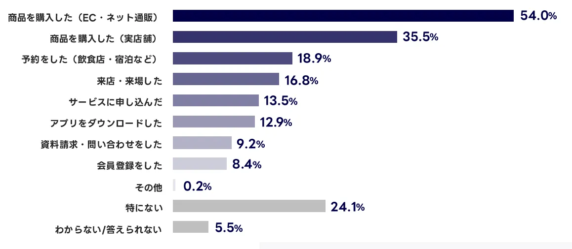 さらに、最近1カ月以内に「検索をきっかけにECサイトで商品を購入した」経験がある人は54.0%と、半数を超えています。この結果から、検索は単なる情報収集にとどまらず、実際の行動や購入につながる重要な接点であることが読み取れます。