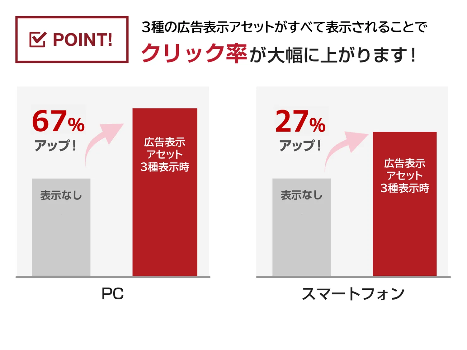 クイックリンクアセット、テキスト補足アセット、カテゴリ補足アセットの3つを網羅的に設定することで、クリック率がPCで67%、スマートフォンで27%アップ(※)するなど、広告効果向上が見込めます。