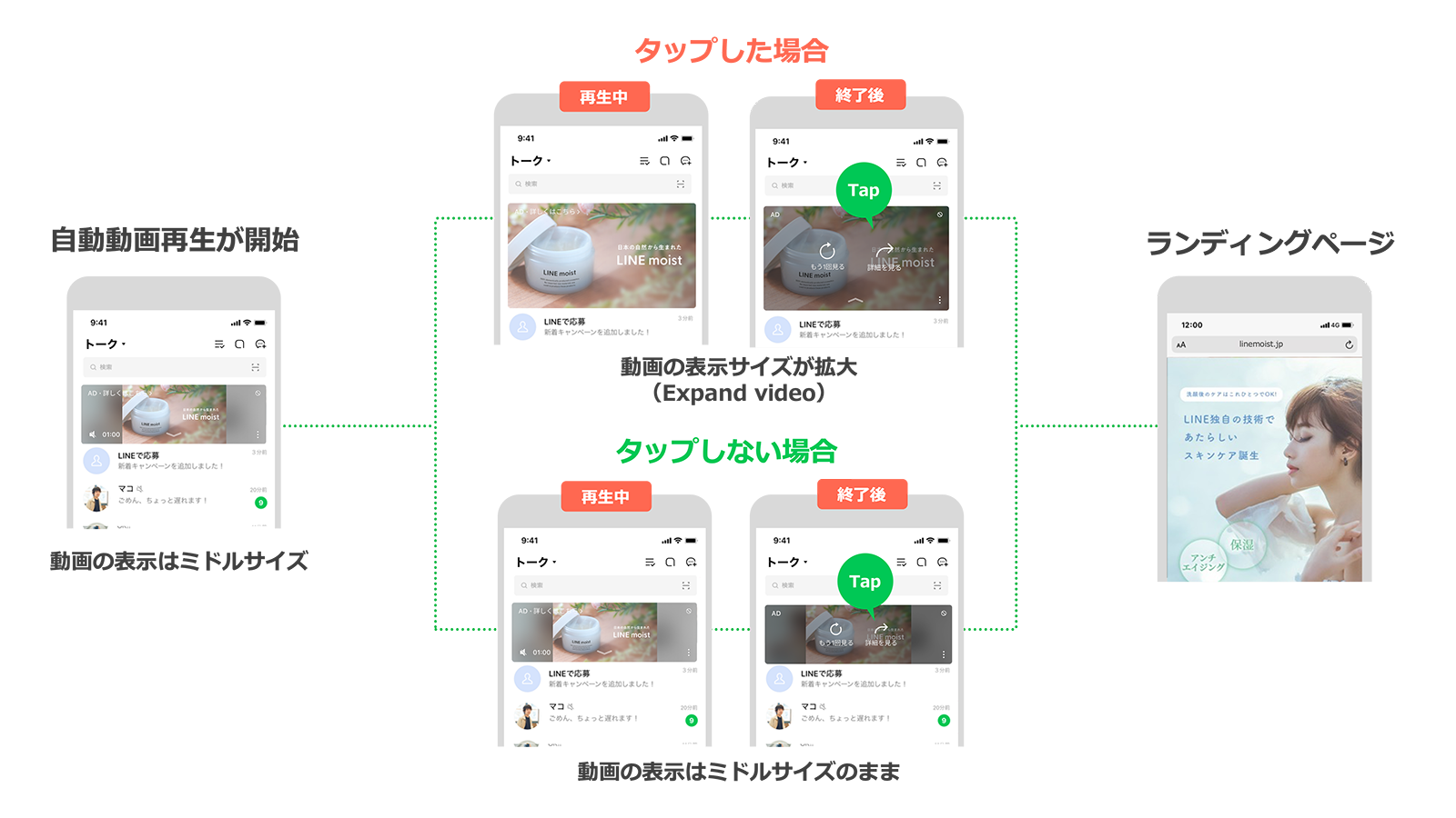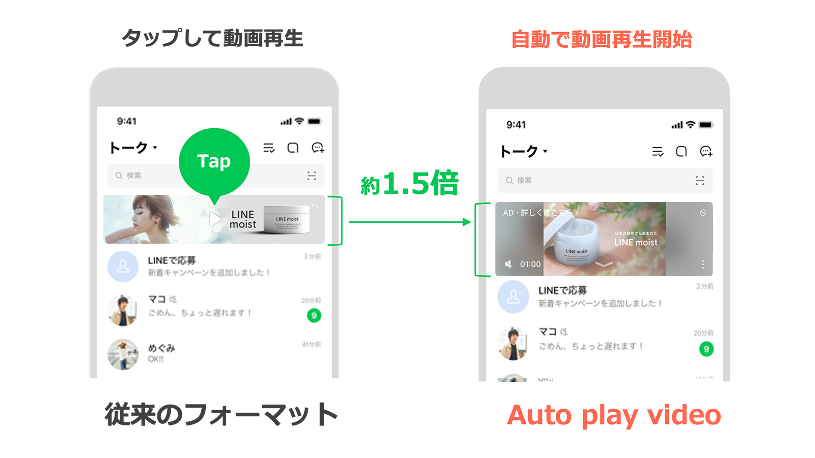 Auto play videoは、Talk Head View、Talk Head View Customにおいて、従来の静止画フォーマットよりも約1.5倍大きなサイズ(ミドルサイズ)で、動画が自動再生される新しい広告フォーマットです。