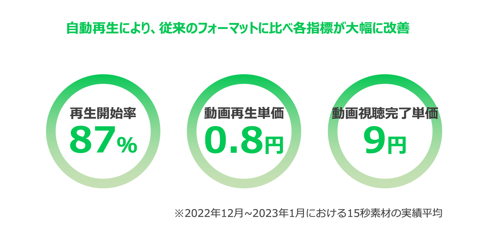動画が自動再生されることでユーザーの目に留まりやすくなるため、サービスや商材をより印象付けやすいというメリットがあります。また、従来のフォーマットに比べて「再生開始率」「動画再生単価」「動画視聴完了単価」など、各指標の大幅な改善にも期待できます。