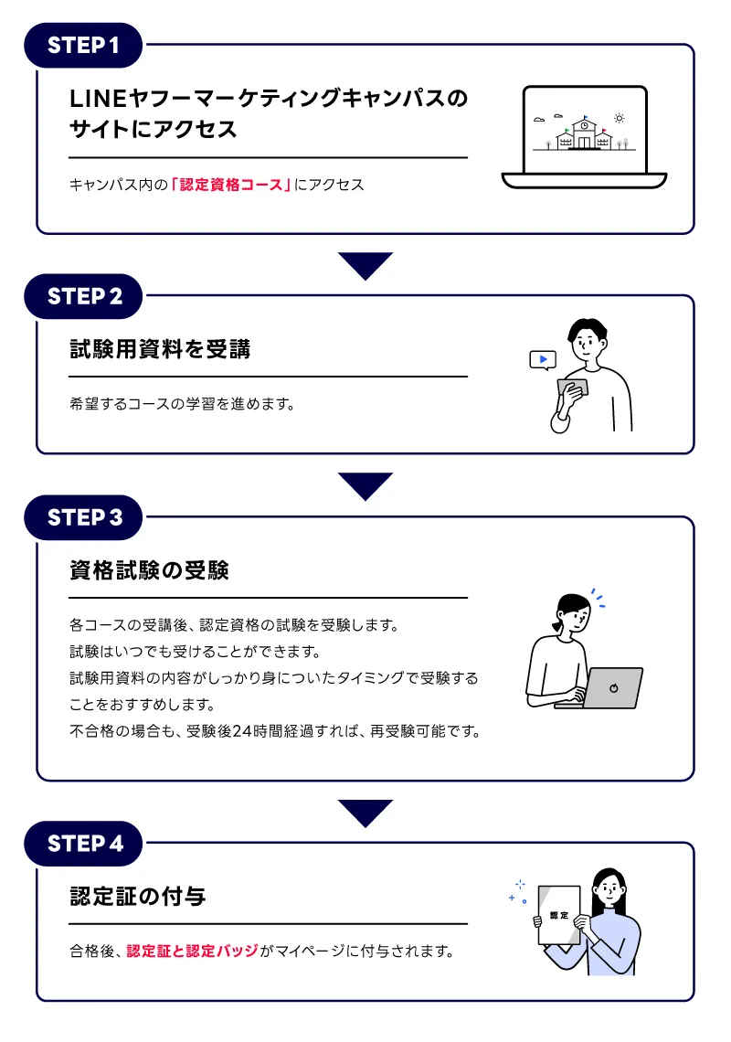 LINEヤフーマーケティングスキルバッジはオンラインで受験できます。受験から資格取得までのステップは以下の通りです。