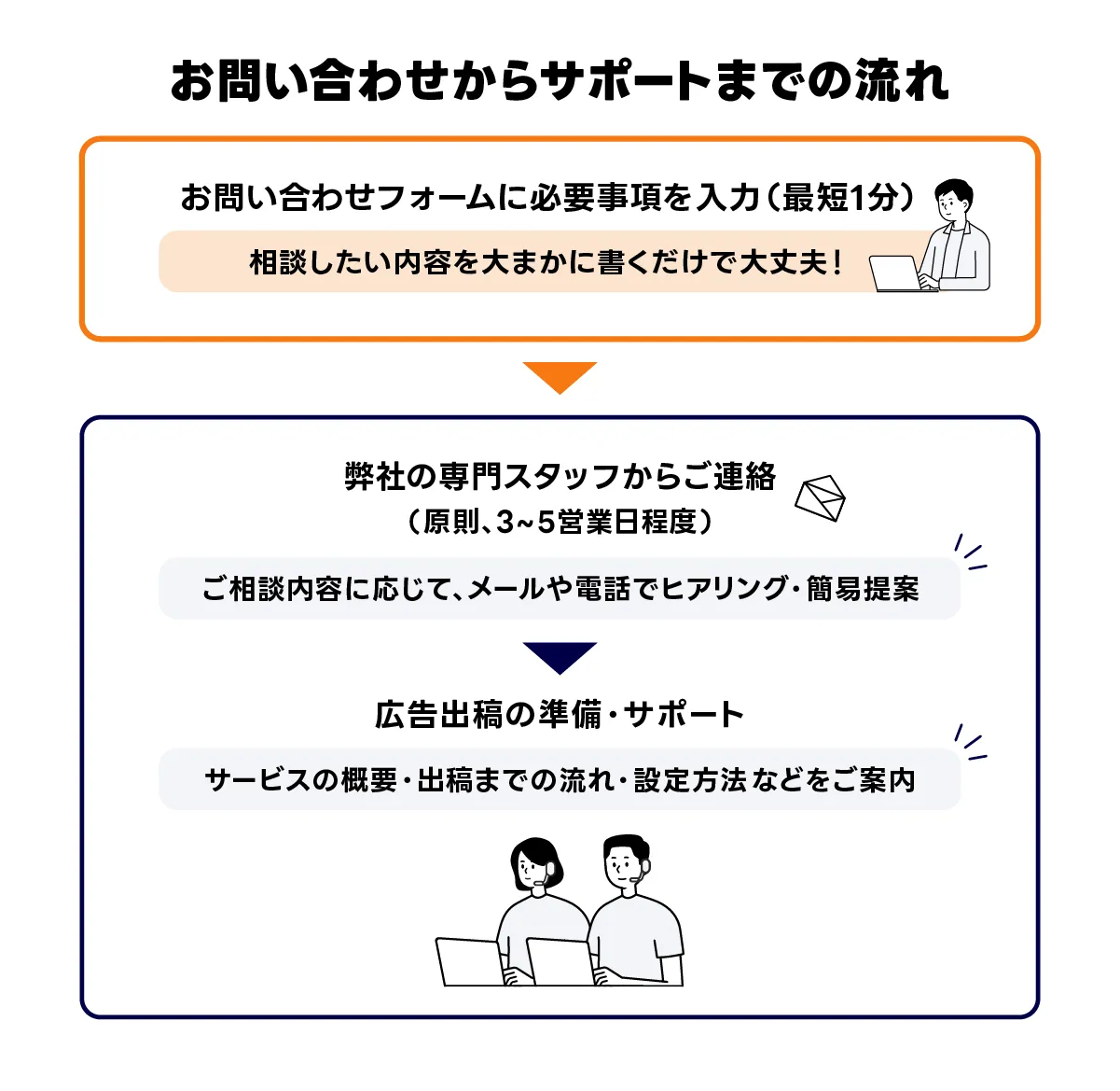 初回のご相談から広告出稿までは、基本的に担当制です。追加の質問や、手続きの中でつまづいた場合も、同じ専門スタッフが一貫して対応しますのでご安心ください。