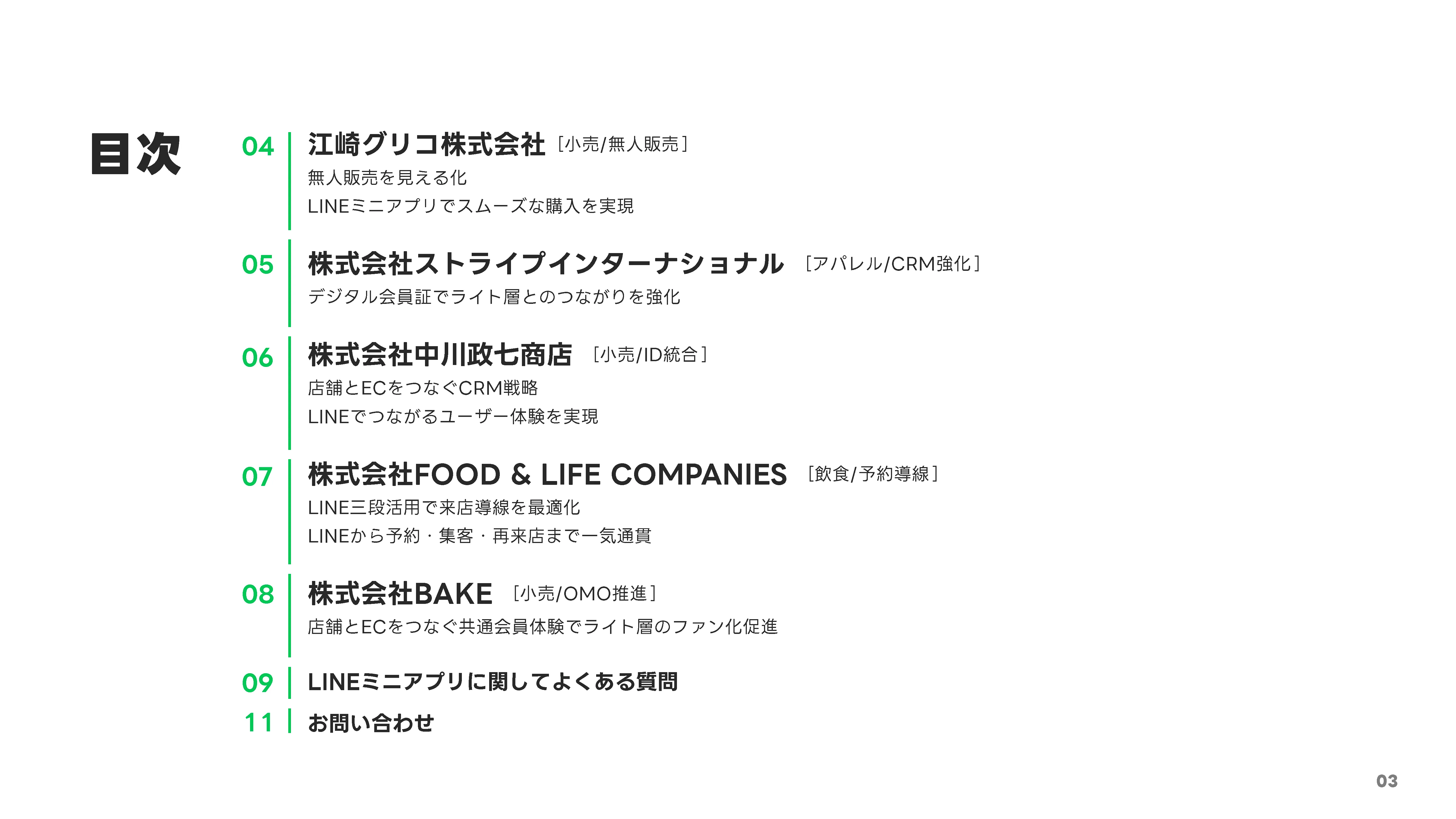 本資料では、LINEミニアプリを導入した企業が抱えていた課題や実施した取り組み、その結果として得られた成功ポイントを企業別に紹介します。