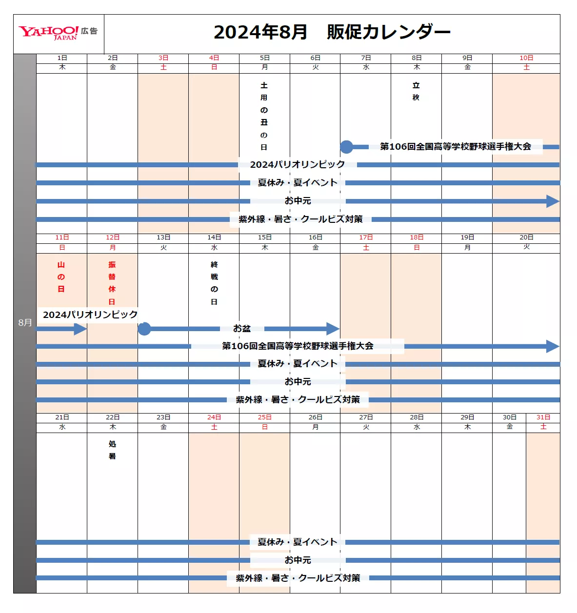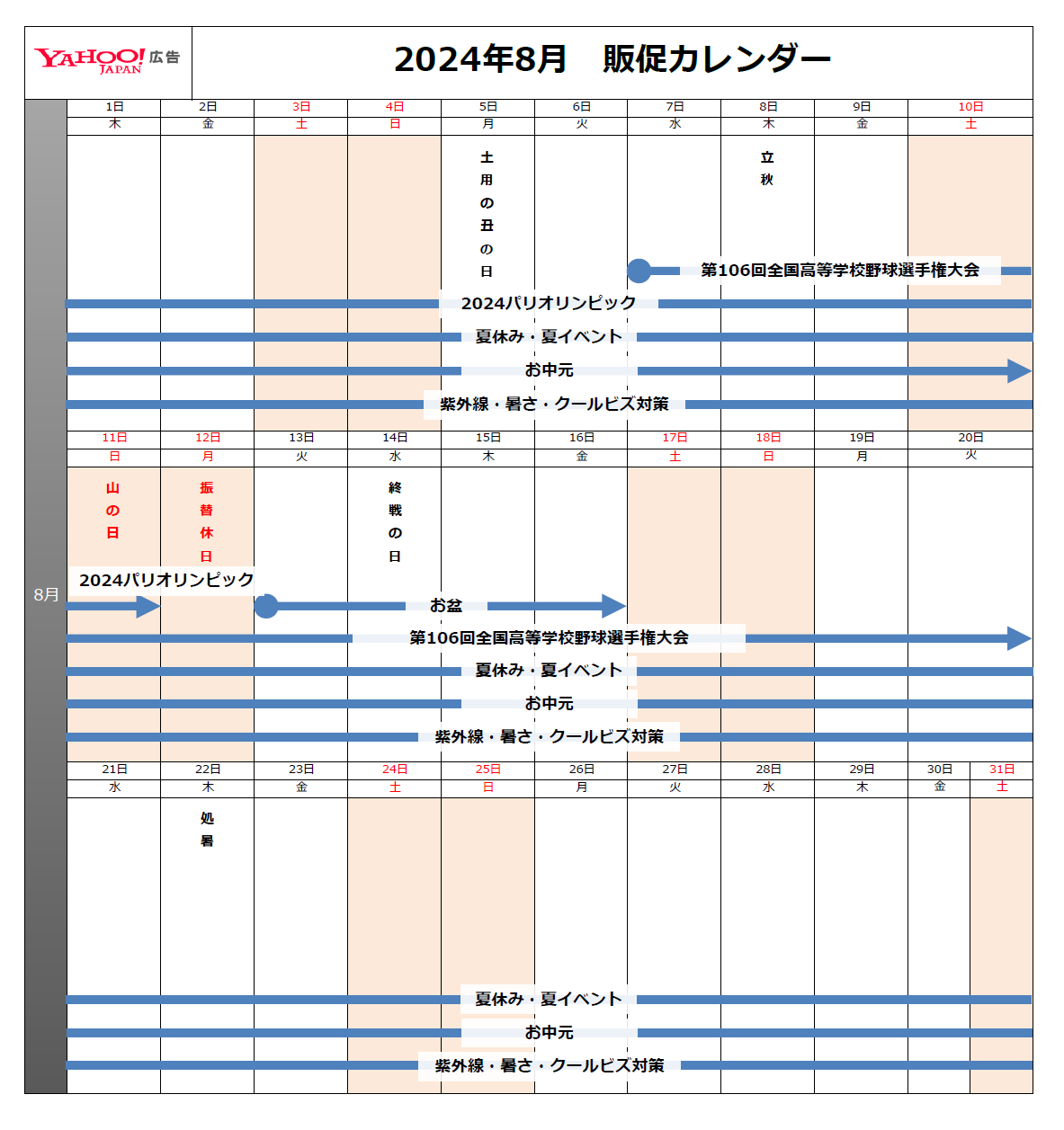 2024年の8月に前月より検索数が急上昇するキーワード、急下降するキーワードを前年の傾向から予測してお届けします。ぜひ広告出稿にお役立てください。