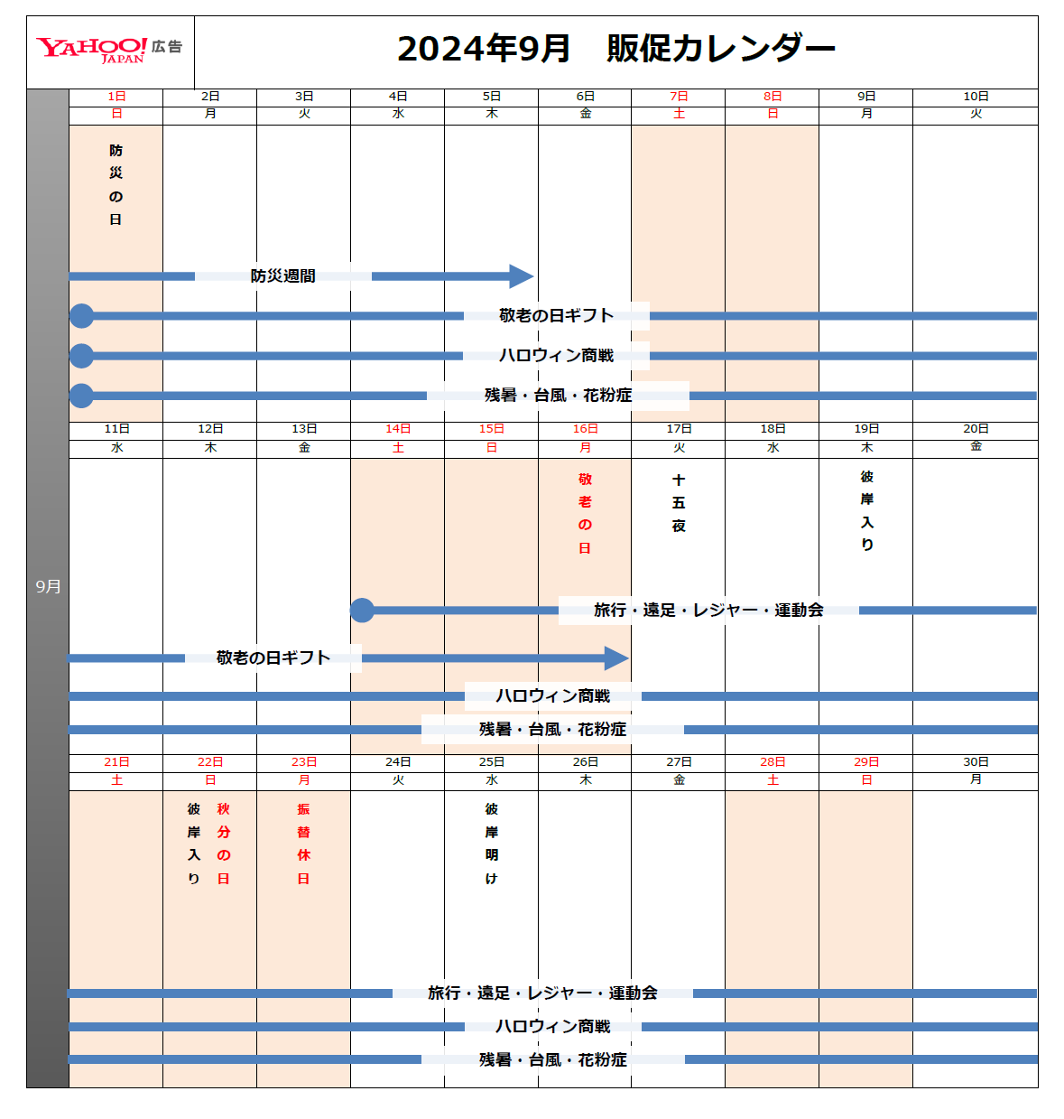 また、9/16は敬老の日。ギフトになる商材を扱っているなら、当日前後の予算設定に注意して商機を逃さないようにしましょう。