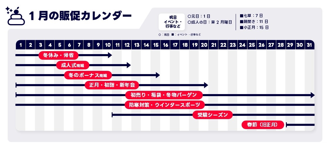 初売りや福袋の販売、年始のセールで実店舗とオンラインともに盛況に。お正月や冬休みで人の動きが活発になるうえ、冬のボーナスやお年玉の影響で消費行動が高まる。