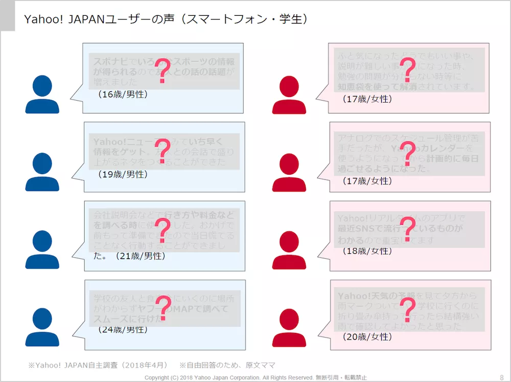 男女を問わず、幅広い世代で利用されているYahoo! JAPANですが、スマートフォンではどのように利用されているのでしょうか。 全国10,300人を対象に行ったアンケート(*2)を基に、サービスの利用理由から、学生、社会人、専業主婦――それぞれの属性における利用シーンまで紹介します。
