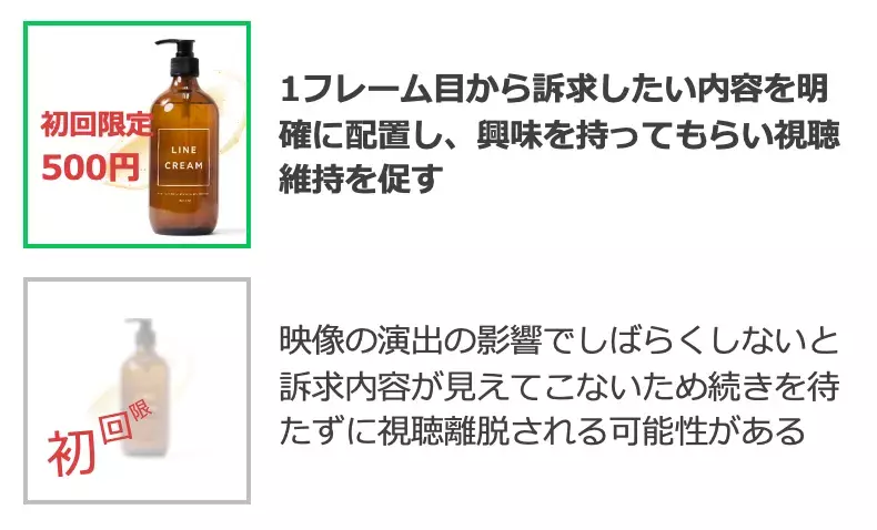 表示された瞬間にアテンションを得ることができるような1フレーム目、1シーン目を意識しましょう。