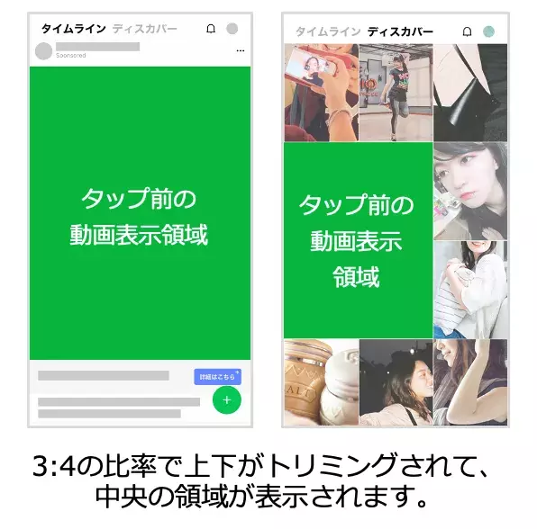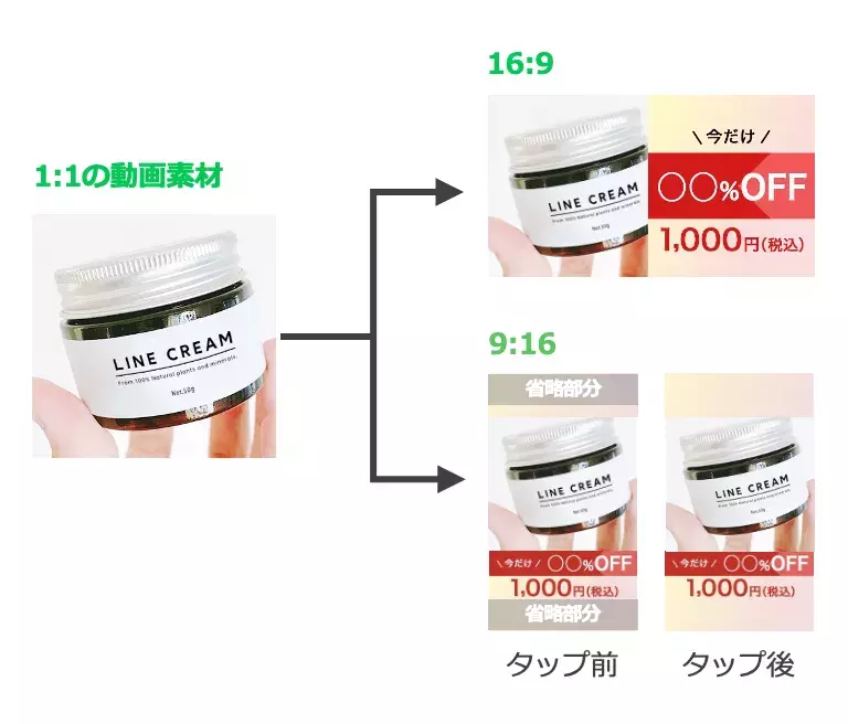9:16のサイズを使用する際には、タップ前は上下がトリミングがされた状態で配信されるためレイアウトにご注意ください。