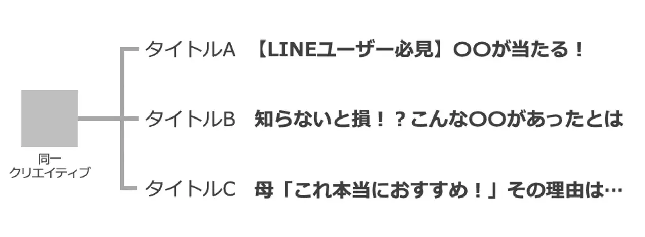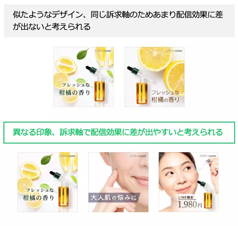 また、何の要素が配信効果に寄与したのかを判断しやすいような作り分けをしましょう。