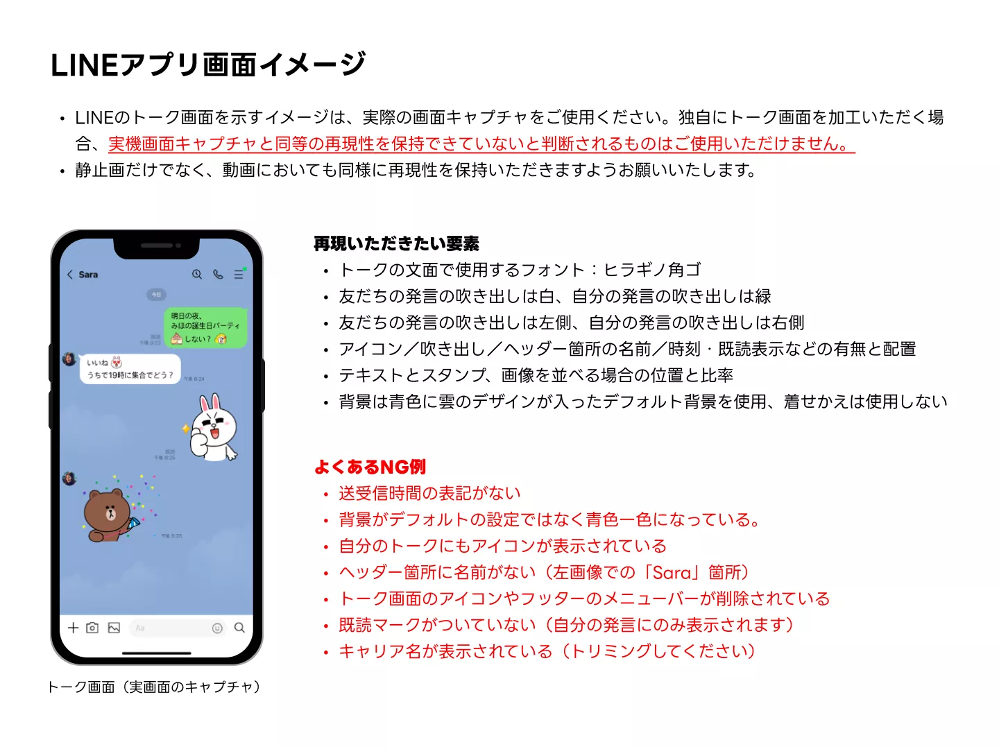 LINEのトーク画面を示すイメージは、実際の画面キャプチャをご使用ください。独自にトーク画面を加工いただく場合、実機画面キャプチャと同等の再現性を保持できていないと判断されるものはご使用いただけません。