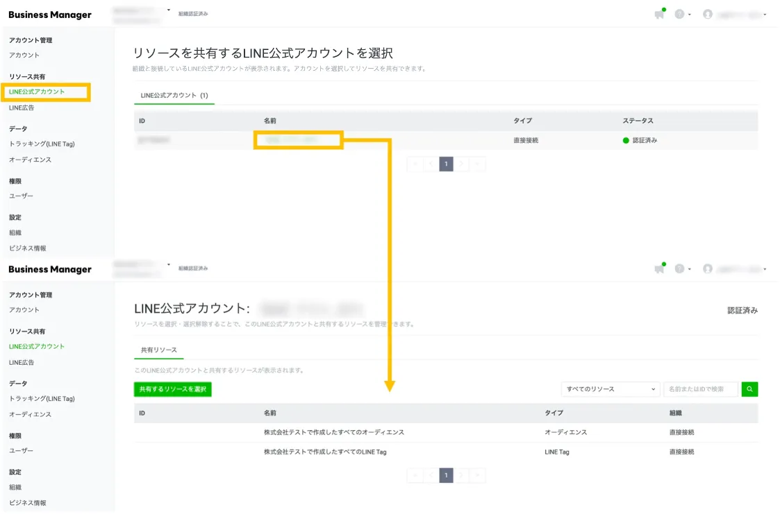 配下のオーディエンスやLINE Tagなどのリソースを互いに共有することが可能になります。