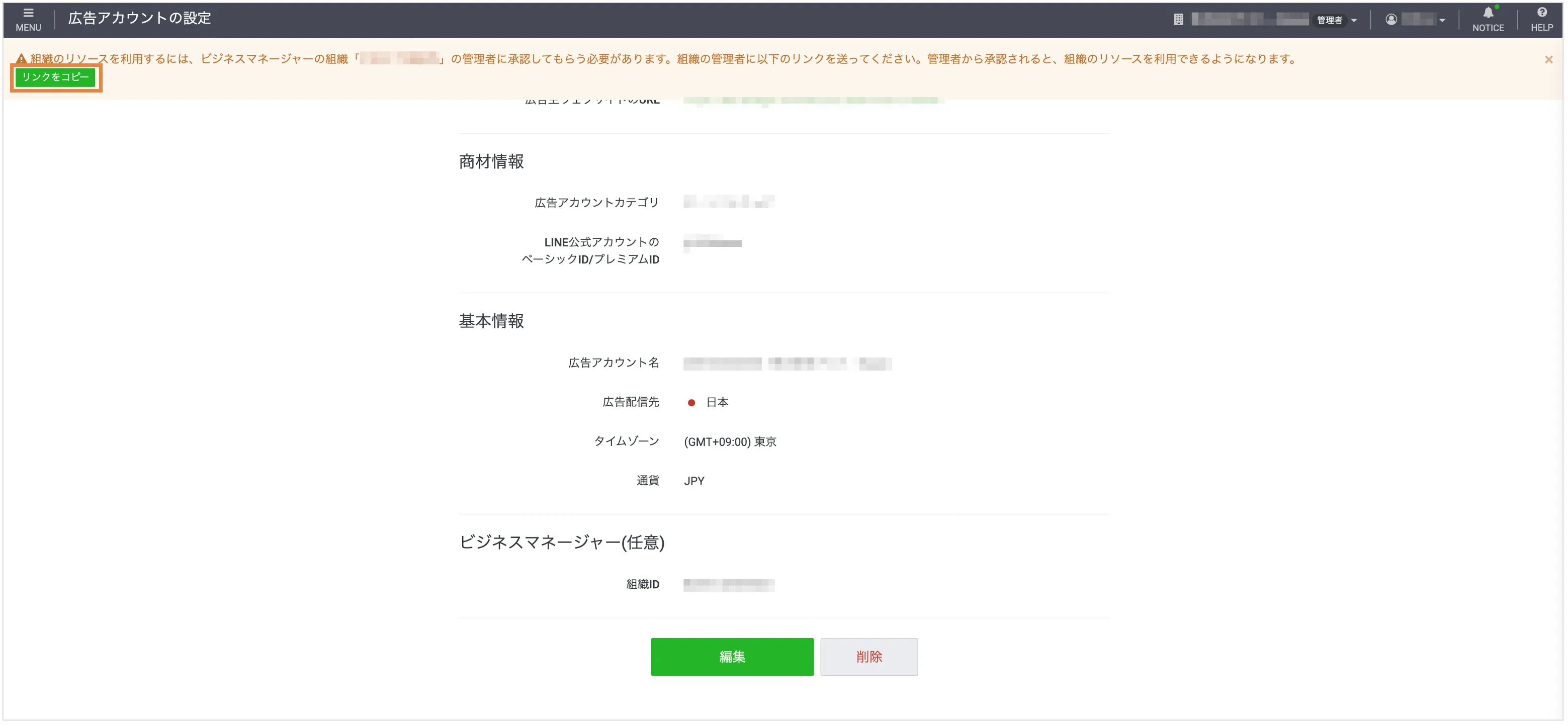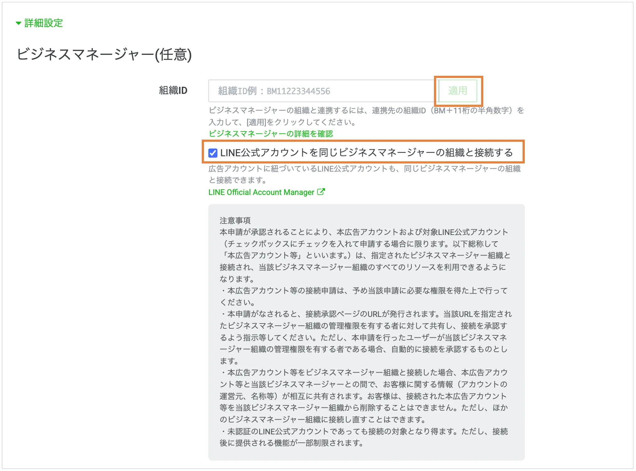 LINE広告の管理画面でビジネスマネージャーの組織IDを入力し、ビジネスマネージャー側で承認することで接続が完了します。
