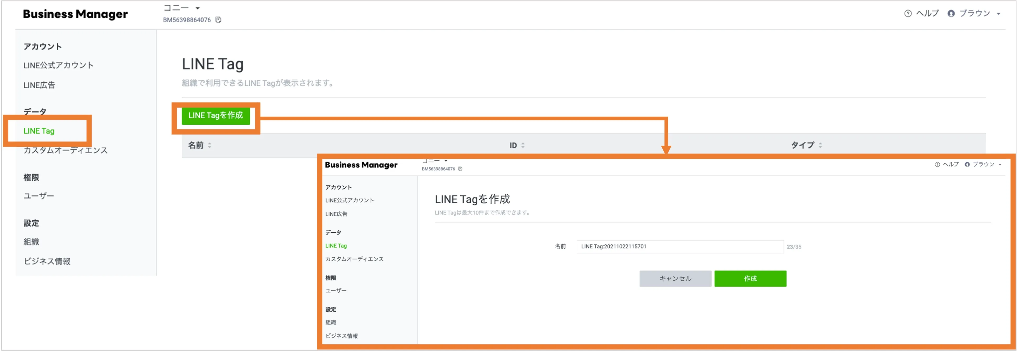「LINE Tagを作成」をクリックし、作成したいLINE Tagの名前を入力して「作成」をクリックします。