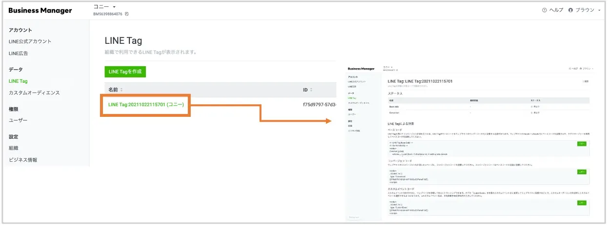 作成したLINE Tagの詳細は、LINE Tag一覧からLINE Tagの名前をクリックすることで確認できます。