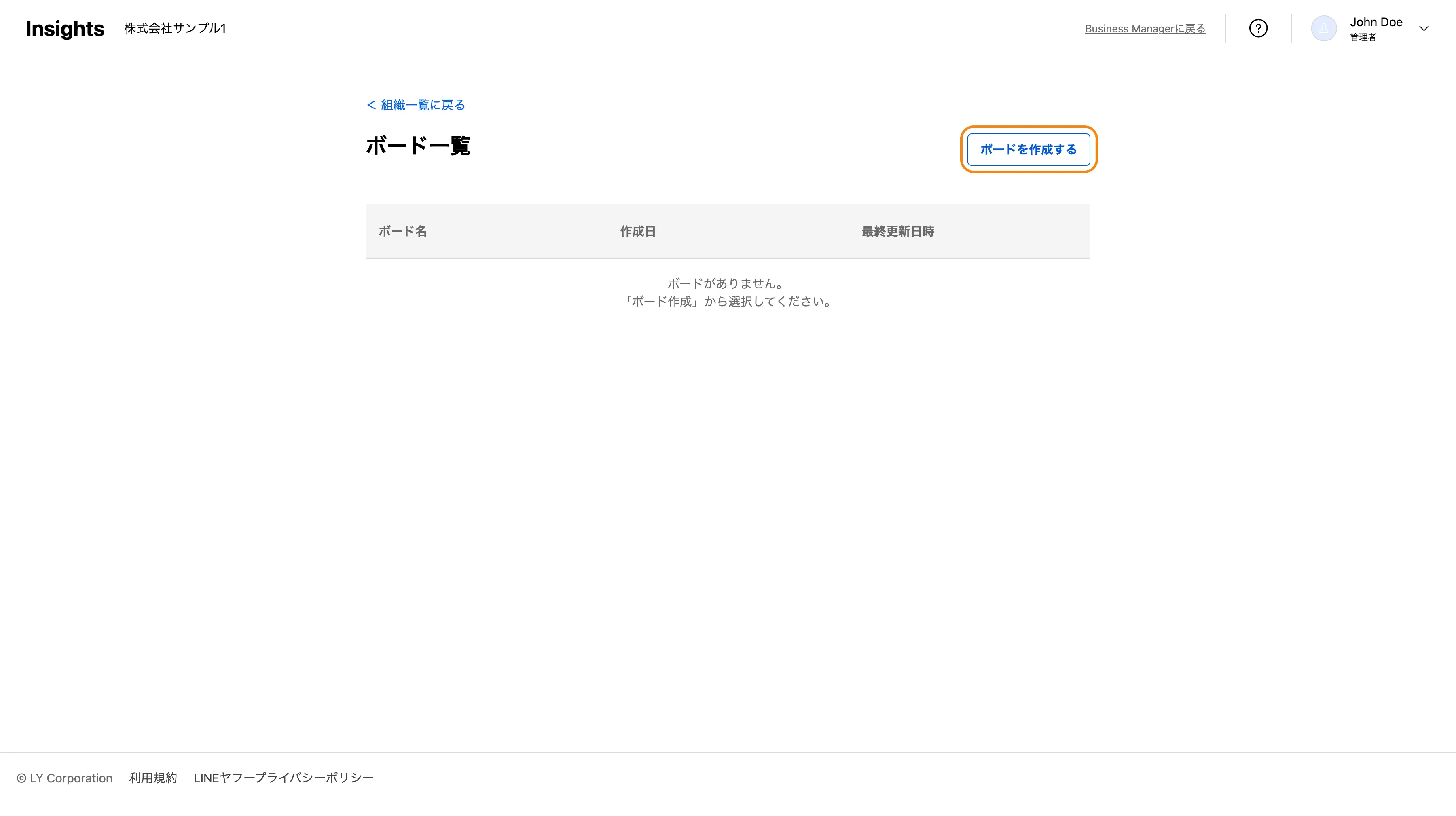 インサイト機能にアクセスすると、組織が一覧表示されます。データを可視化する組織を選択してください。組織を選択するとボードが一覧表示されます。「ボードを作成する」ボタンを押します。