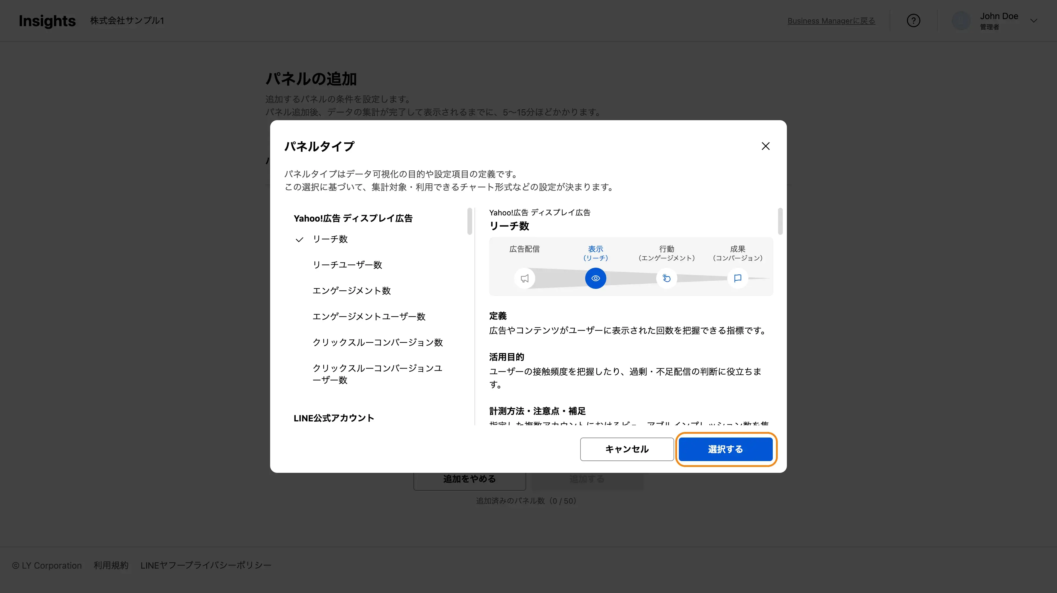 パネル追加画面が表示されたら、まずパネルタイプを選択します。パネルタイプはデータ可視化の目的や設定項目の定義です。説明を確認し、追加するパネルタイプを選択します。