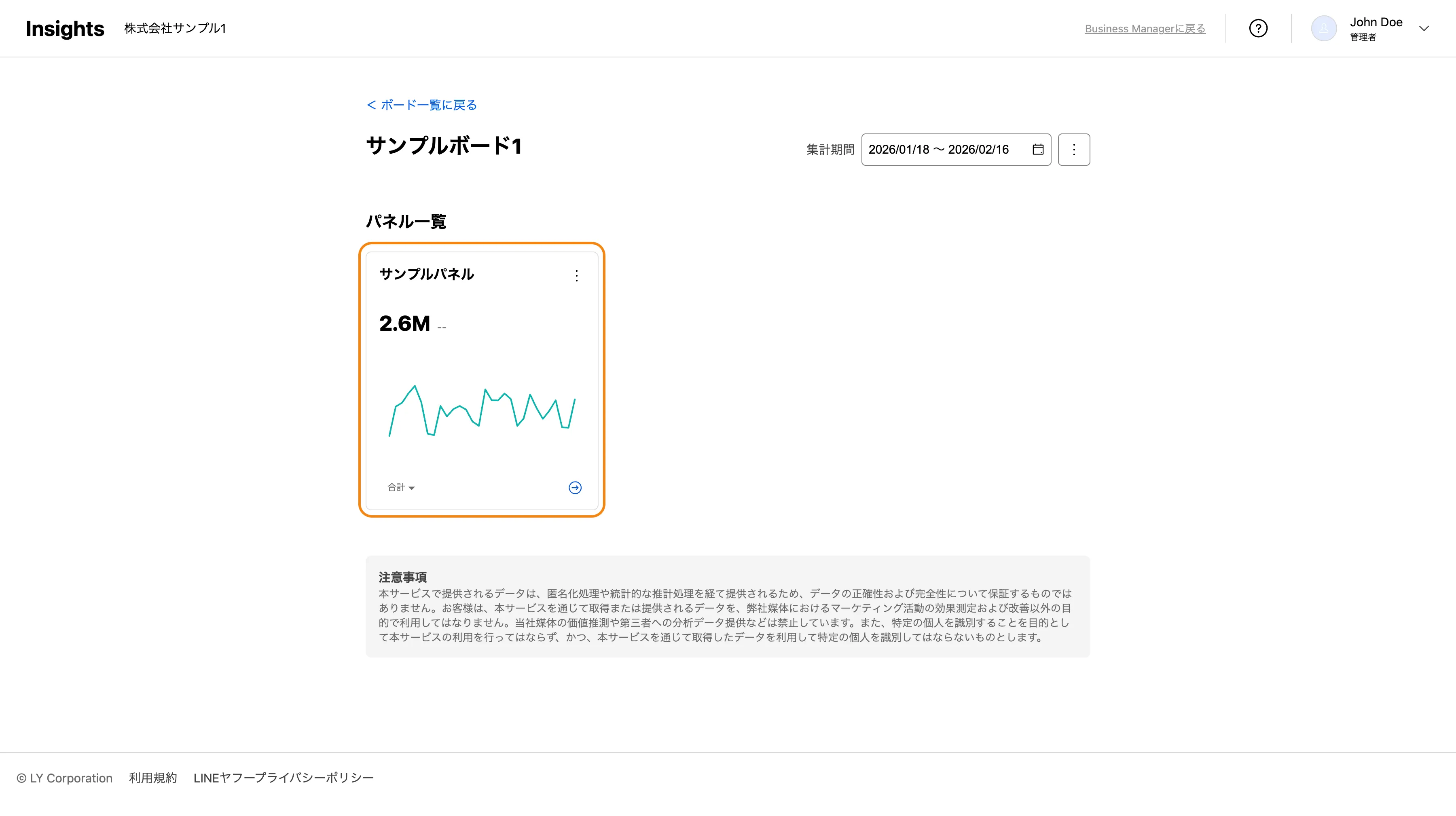 集計期間:日付を選択して、任意の期間のデータを表示できます。400日前から2日前までの399日間からの任意の期間を選択できます。パネルの追加が完了すると、パネルタイプに応じた所定の過去日数分を集計が行われ、以降は日次でデータが蓄積されます。集計が行われていない期間を指定してもデータは表示されません。