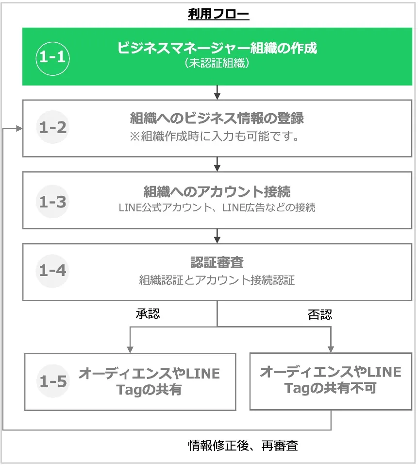 オーディエンスやLINE Tagの共有には、以下の手順が必要となります。