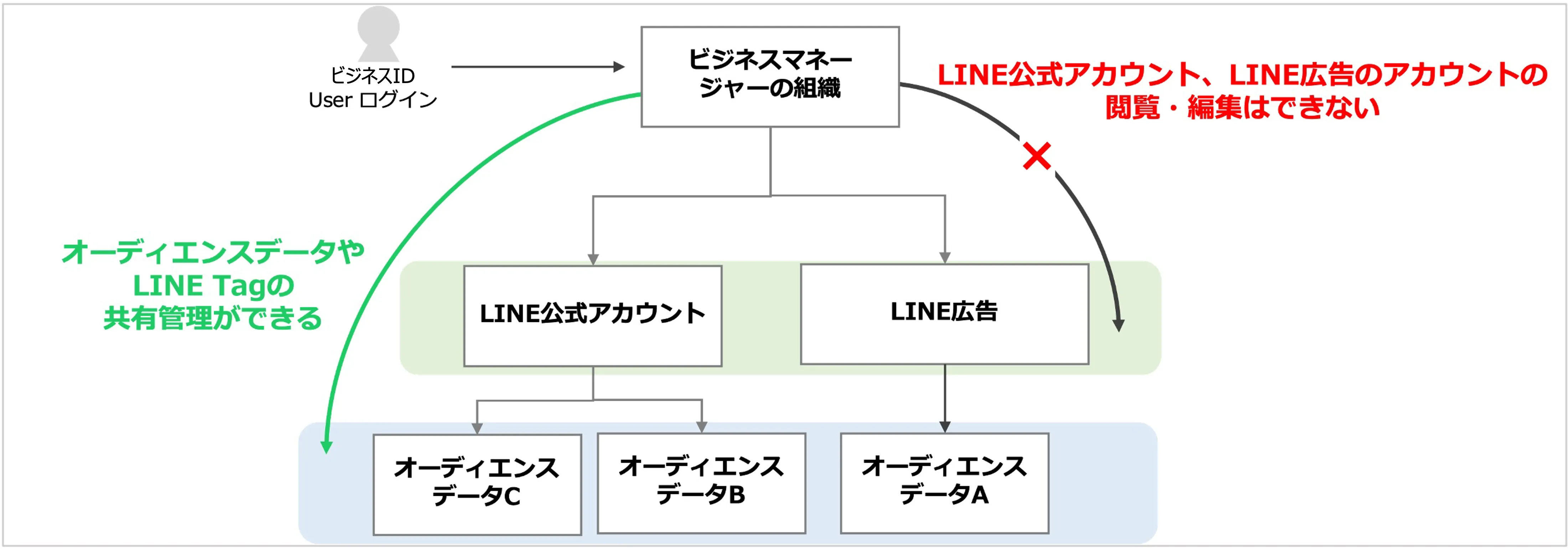 ビジネスマネージャー上でのオーディエンスやLINE Tagの作成や管理が可能です。各種アカウントの接続や接続しているアカウントのリストを閲覧することはできません。 |