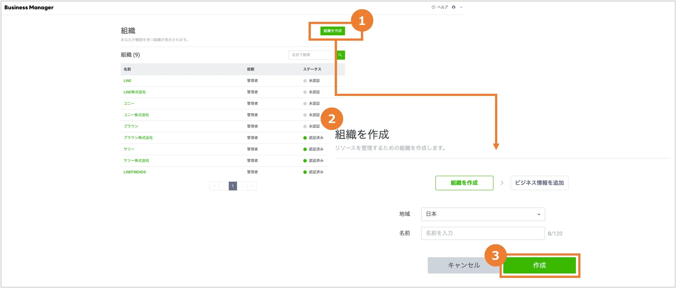 ビジネスマネージャーの管理画面から下記手順で組織を作成します。