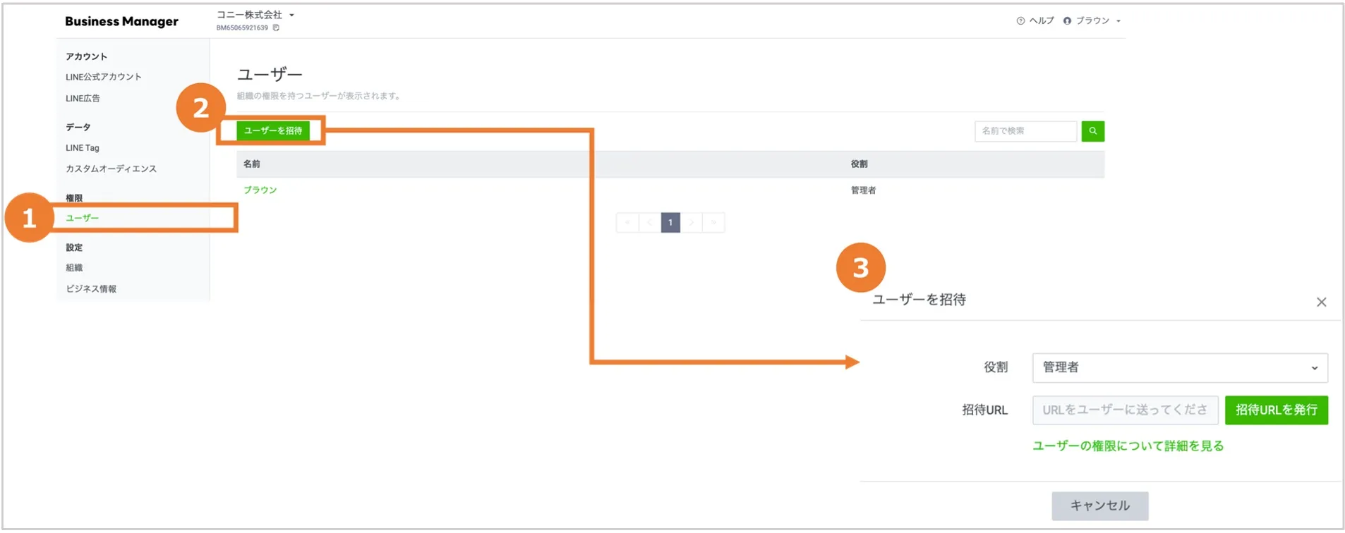 招待されたユーザが、招待URLを開いてログイン画面に遷移し、ビジネスIDを入力してビジネスマネージャーにログインすることで招待完了