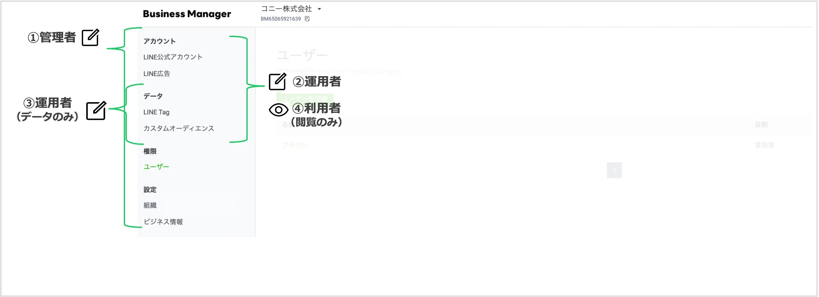 | ②運用者 | リソース(オーディエンスやLINE Tag)の共有管理が行えます。また、ビジネスマネージャー上でのオーディエンスやLINE Tagの作成や管理が可能です。 |