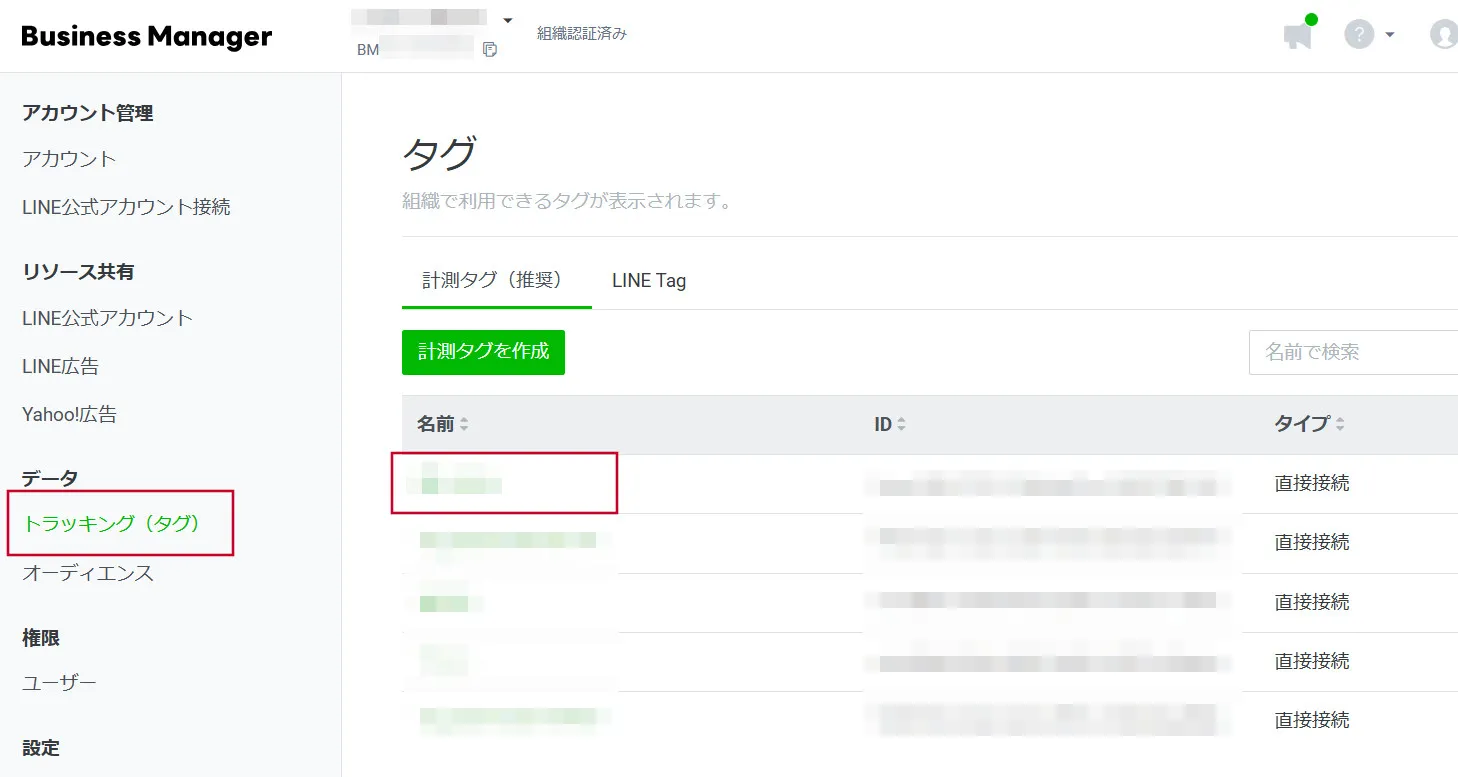 「トラッキング(タグ)」画面で、アクセストークンを発行する計測タグをクリック