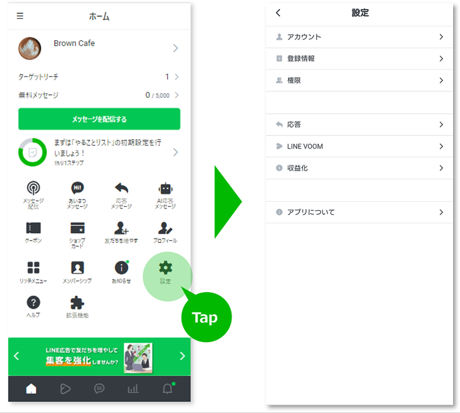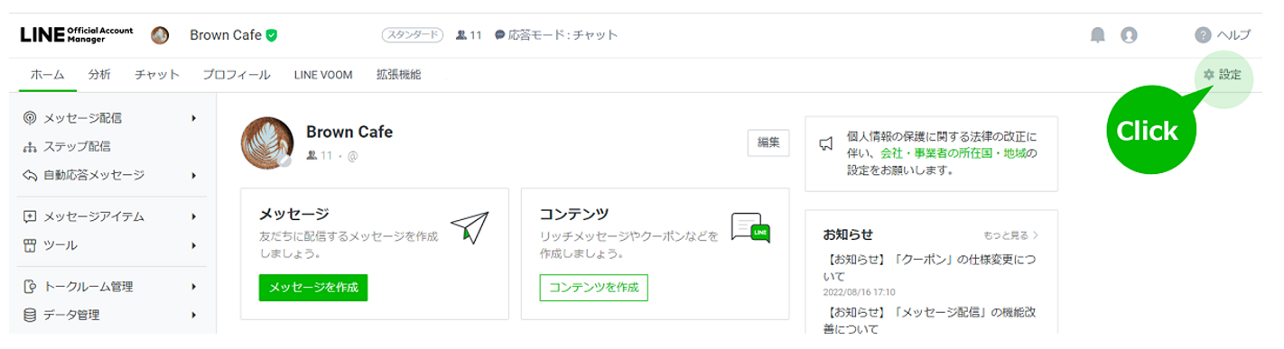 「設定」では 、LINE公式アカウントに関する基本的な設定を行います。