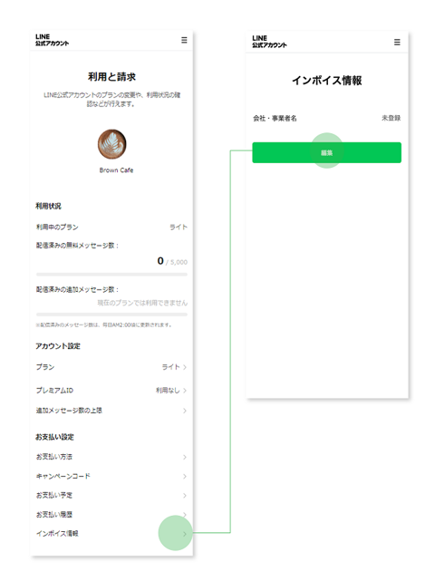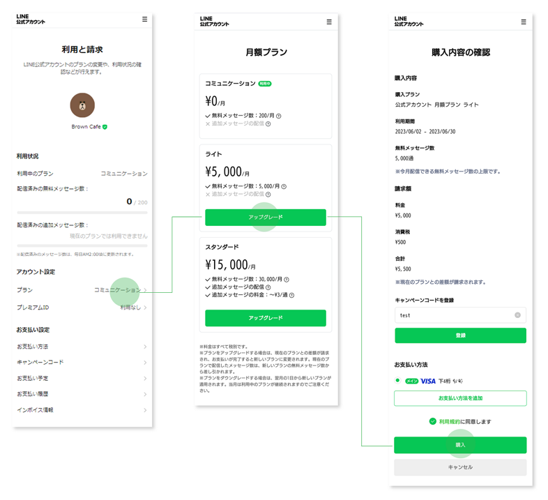 管理アプリ経由でLINE公式アカウントをご利用いただく際、プラン変更やお支払い関連の管理を行う場合にはスマートフォンブラウザ向け購入画面からお手続きをお願い致します。