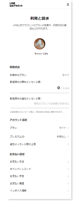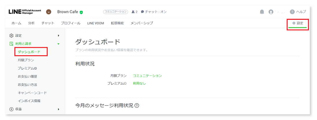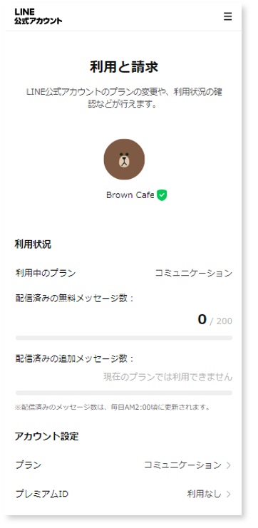「設定」>「利用と請求」メニューでは、現在のプランやメッセージの利用状況が確認・変更できます。