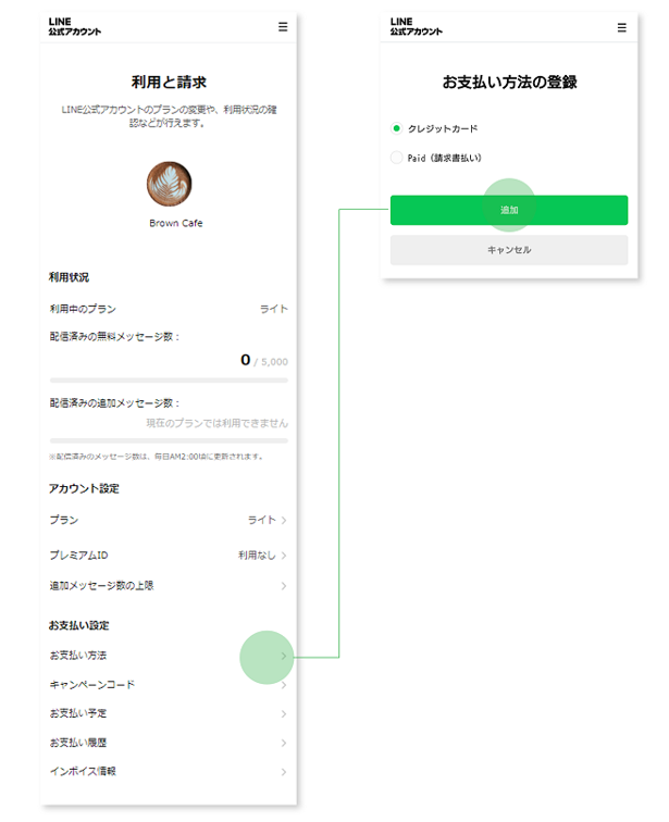 - 「お支払い設定」>「お支払い方法」を選択します。