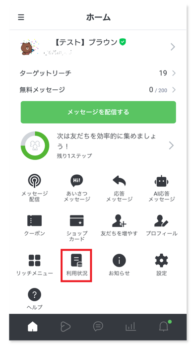 トップページの「利用状況」から、利用中のプランや配信済みのメッセージ数などの情報が確認できます。
