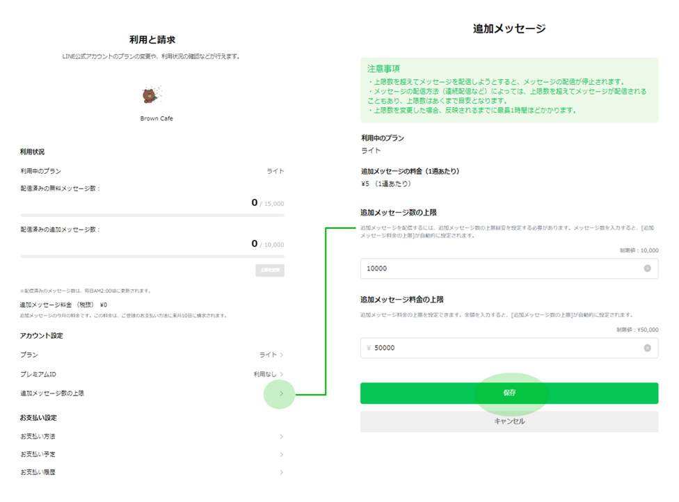 - 追加メッセージ数および追加メッセージ料金の上限を設定し「保存」を選択。