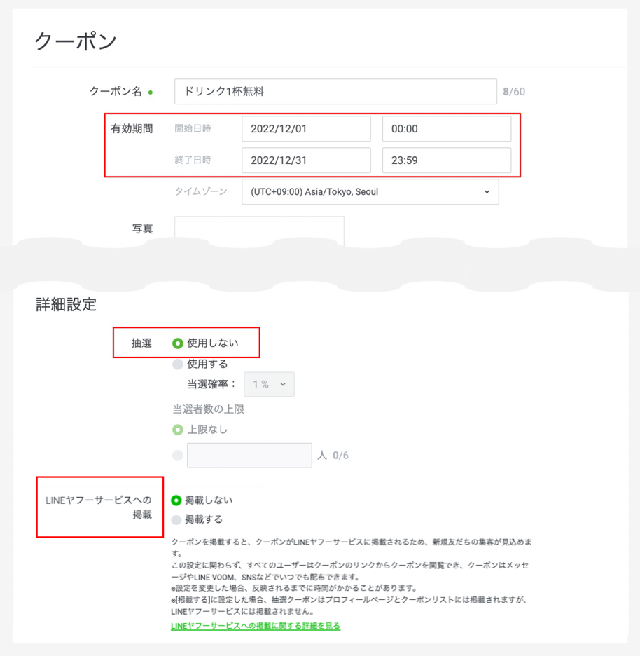 LINEチラシにクーポンを掲載する場合、以下、クーポンの設定をご確認ください。