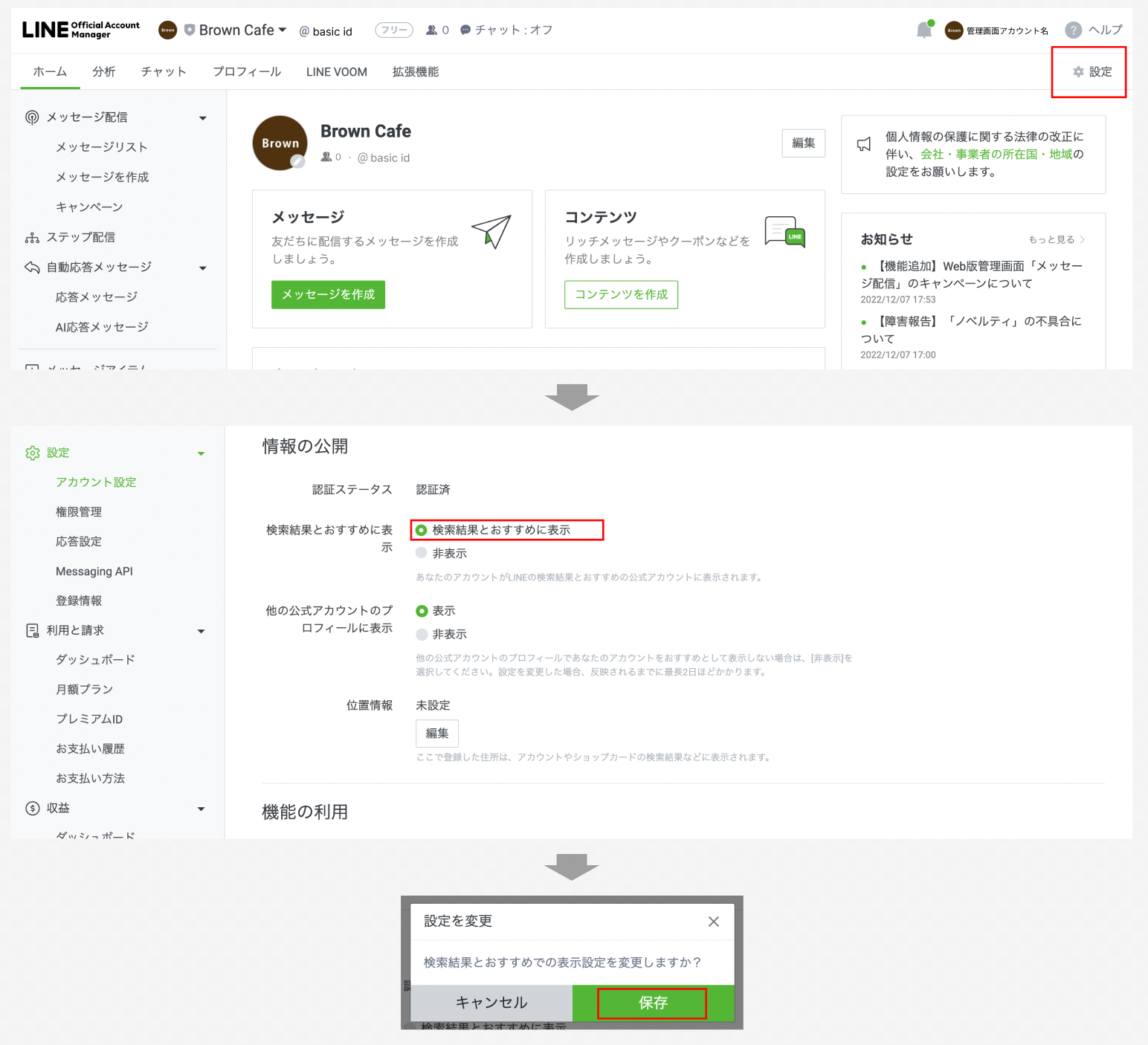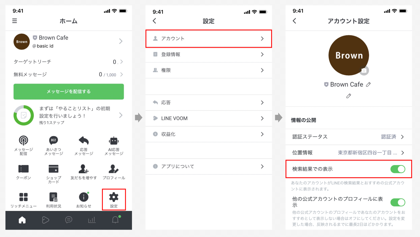 ②アカウント設定で 検索結果とおすすめに表示を「表示」と設定してください