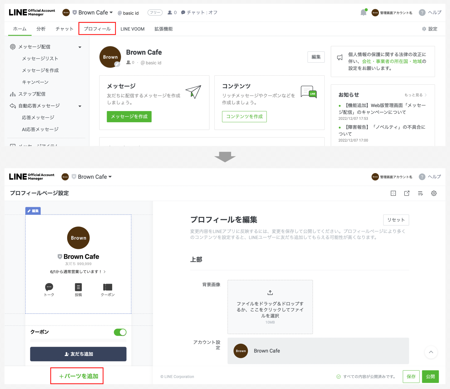※ プロフィールページには、クーポンのLINEサービスに掲載を「掲載する」と設定している場合は抽選クーポンも掲載されます