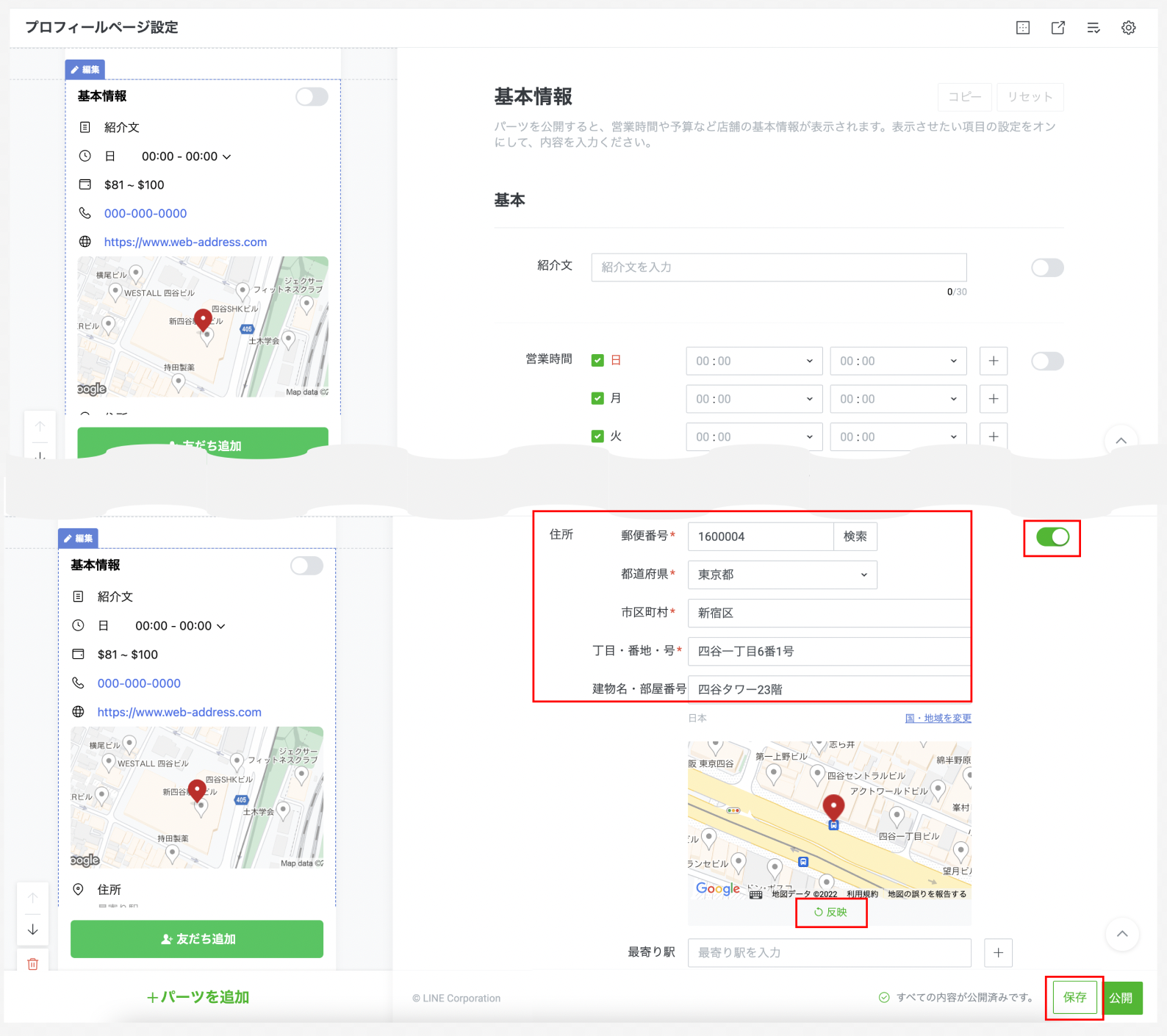 - 5.地図下の「反映」ボタンをタップし、保存ボタンをタップする(合わせて他の情報も入力することをおすすめします)