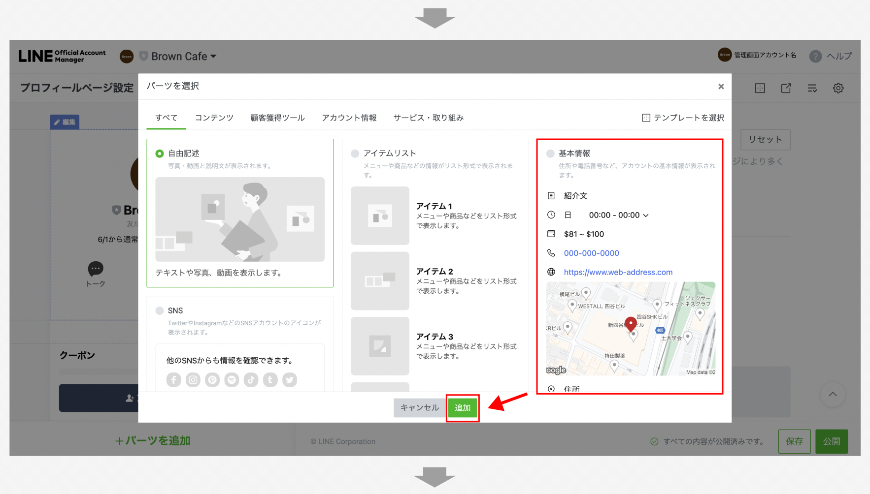 - 7.画面左のイメージ欄にある基本情報のパーツに「チェック」を入れ、「公開」をクリックする