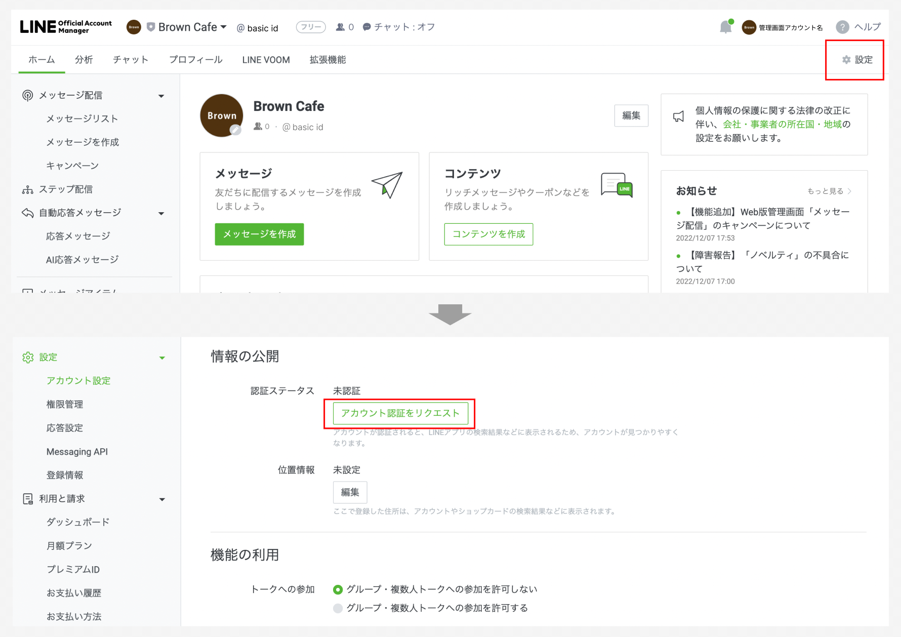 - LINE公式アカウントの開設時、もしくは管理画面から「認証済アカウント」の申請を行うことができます。