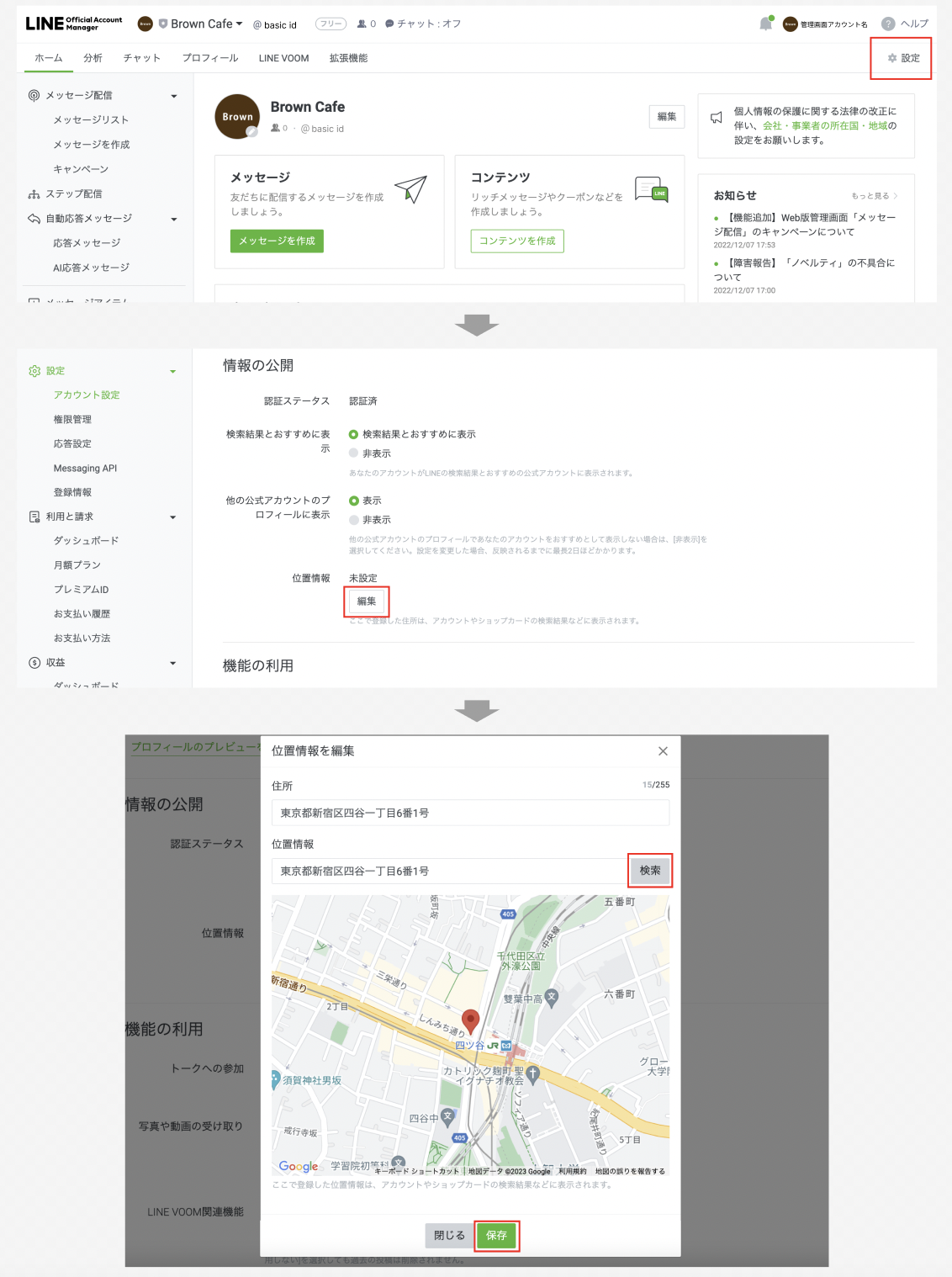 位置情報をもとにクーポンを掲載する画面においては、アカウント設定の情報の公開の位置情報の設定もしくは、プロフィールの基本情報の住所設定(③-1)が必要です。
