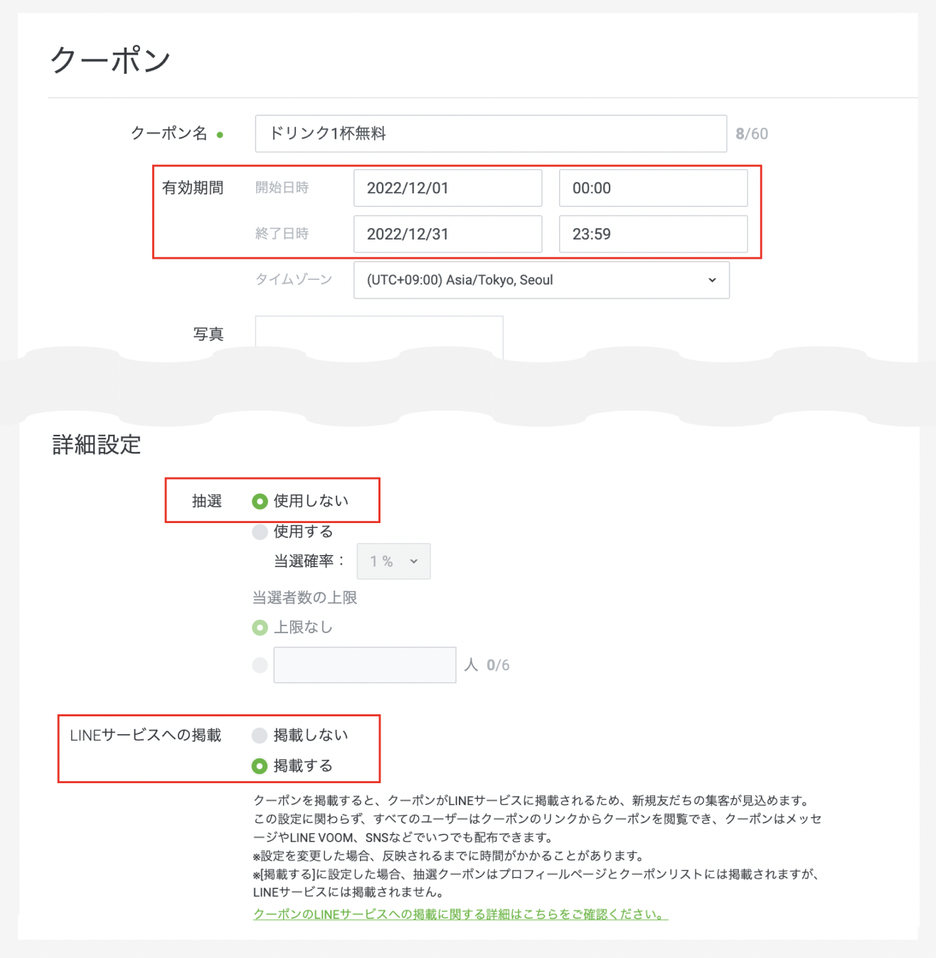 クーポンをLINEサービスに掲載するためには、クーポンを以下の設定にしてください。