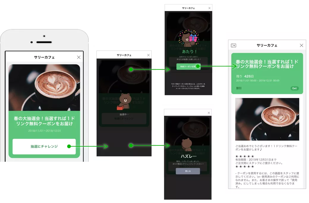 あたりがでると抽選メッセージのリンクがクーポンページにリダイレクトします。