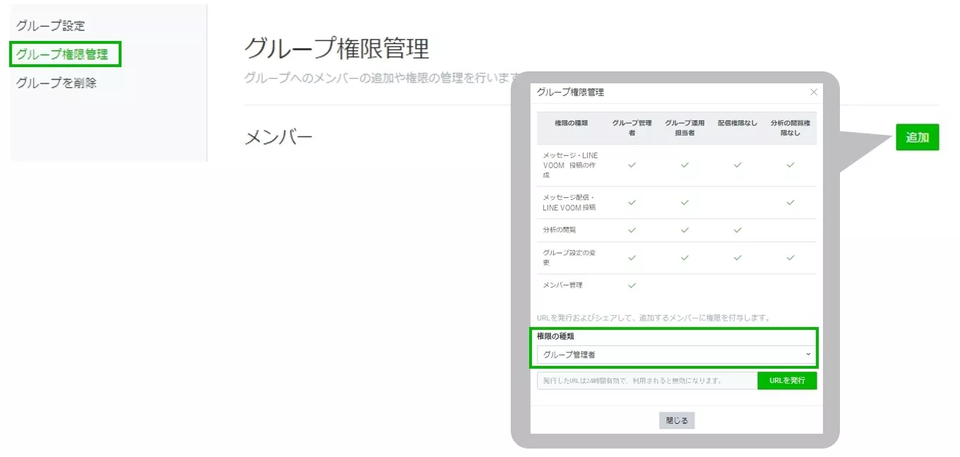 「削除」をクリックするとグループからアカウントを削除できます。④ グループを管理・運用するメンバーと権限が表示されます。50人までの登録が可能です。作成時はメンバーは追加できません。