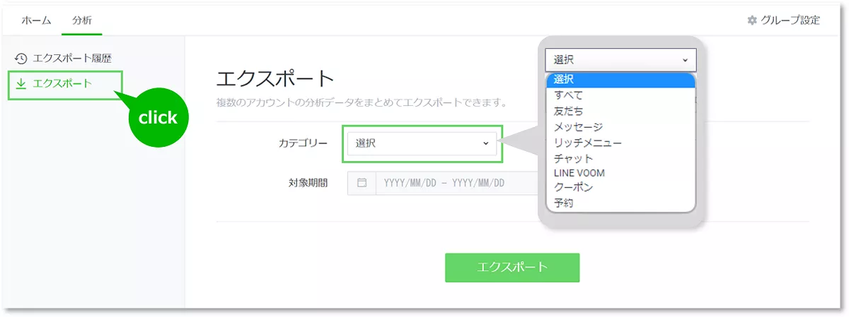 「分析」タブをクリック後、「エクスポート」メニューからカテゴリーと対象期間を選択しCSV形式でエクスポートして確認することができます。