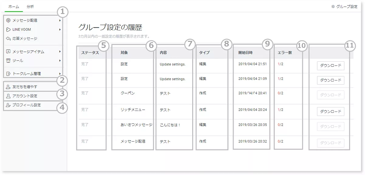 コンテンツを作成できるメニュー一覧です。 グループ機能ではアカウント単体とほぼ同じ操作でメッセージやLINE VOOMなどの一括作成・投稿が可能です。 作成時や保存時の確認画面の文言が変わる他、一部差分については以下をご確認の上各項目の設定方法をご確認ください。