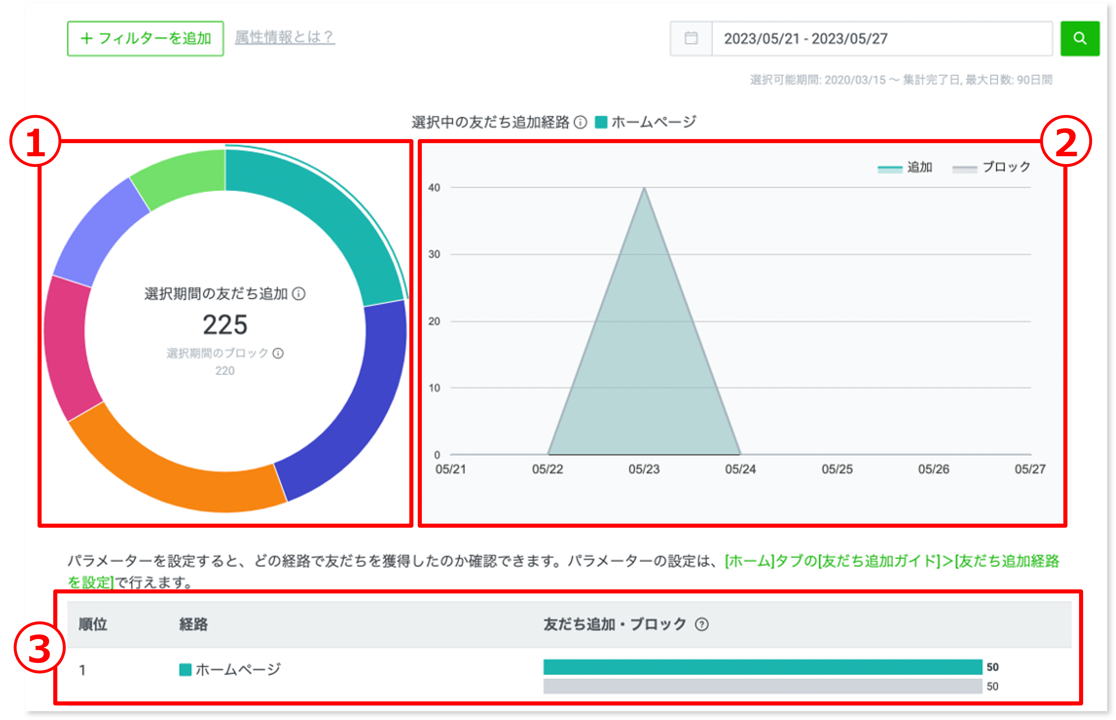 | ③ | テーブル上の数値 | 選択した期間における「ホームページ」経路の友だち追加及びブロックがそれぞれ50回あったことを示しています。 |
